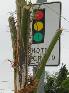Warning Sign Blocked - Santa Anita at Lower Azusa A reader sent photos of the Santa Anita / Lower Azusa intersection, showing that a required warning sign (see Defect # 4) was blocked by a palm tree, until March 11, 2005. ![]() (Photo taken after trimming of tree.) The obscured warning sign would affect the validity of all tickets at that intersection, not just the southbound left turn. The photos are a big file, 1500 kb, so are on a separate page. Photos, southbound Santa Anita sign El Monte Docs Set #