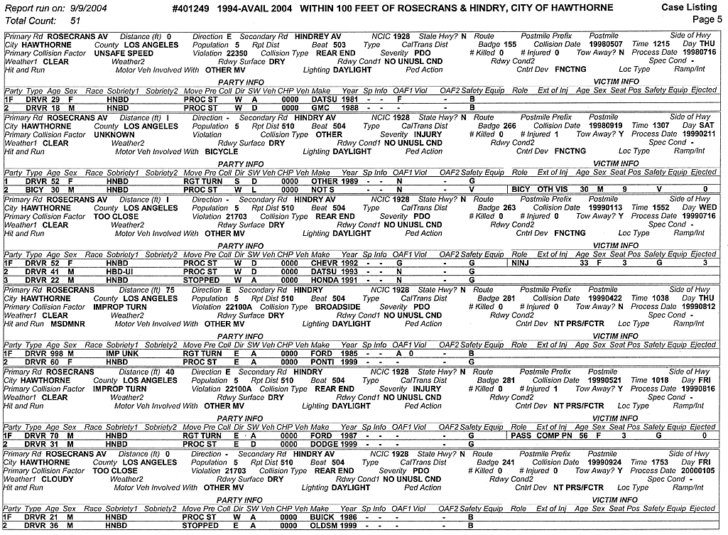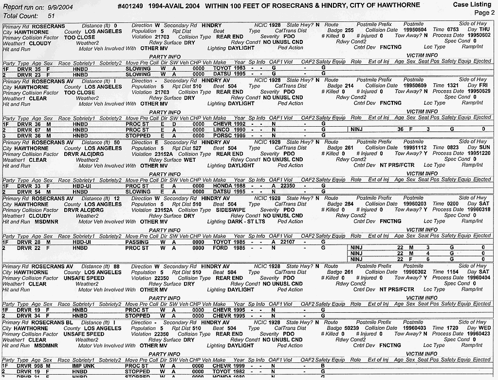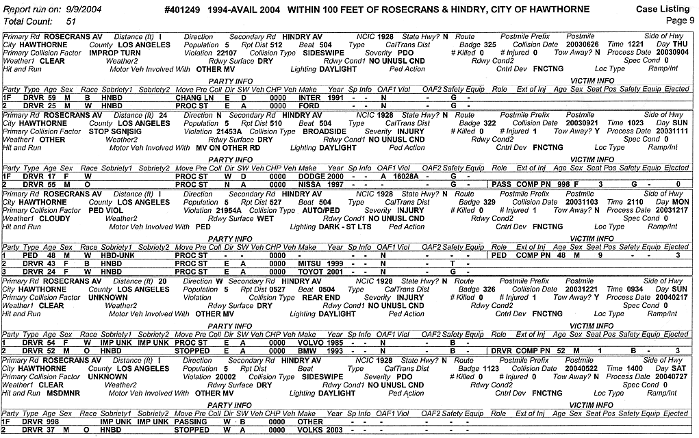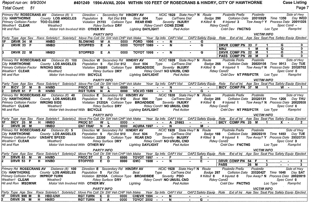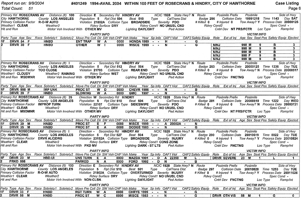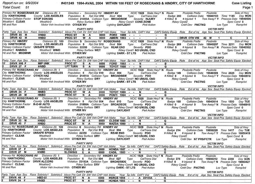 Rosecrans / Hindry Cameras Not Justified - Continued New 11-14-04 Here are the six pages that do not contain accidents caused by drivers turning left or right. The other three pages of the SWITRS report are at: Hawthorne Documents - Set # 5. (SWITRS - Statewide Integrated Traffic Records System - reports, are provided to cities and individual citizens, at no cost, by the Information Services Unit of the CHP. If you want a report for an intersection in your neighborhood, go to their website at http://iswitrs.chp.ca.gov. Please note, however, that SWITRS will automatically send the City a copy of whatever they have provided to you.) To keep the reports as compact as possible, SWITRS employs code letters and numbers. Some of those codes are: Party: If an "F" appears after the party number, this is the party indicated by the officer as at fault. Sobriety1: HNBD = had not been drinking. IMP UNK = impairment not checked or known. Dir: Direction of travel. SW: A = passenger car. D = pickup or panel truck. L = bicycle. N = pedestrian. OAF1 & 2 (Other Associated Factors): A, B, C = VC section violation. E = vision obscurement. F = inattention. G = stop and go traffic. L = uninvolved vehicle. M = other. N = none apparent. O = runaway vehicle. Ejected: 0 = not ejected. 3 = unknown. ![]() ![]() Pages 3 and 4 are at: Hawthorne Documents - Set # 5. ![]() ![]() ![]() Page 8 is at: Hawthorne Documents - Set # 5. ![]() The other three pages of the 1994 - 2004 SWITRS report are at: Hawthorne Documents - Set # 5. --------------------------------- RED LIGHT CAMERAS www.highwayrobbery.net www.highwayrobbery.net |